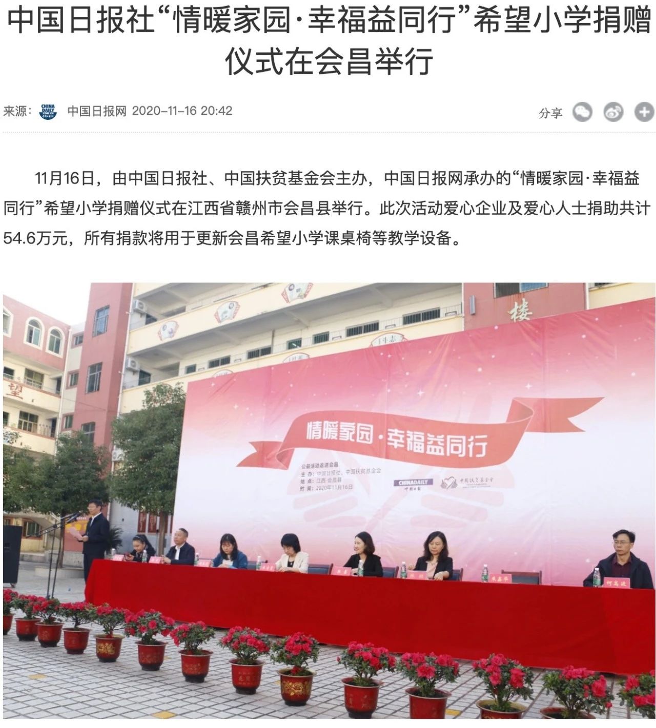 11月16日,由中国日报社、中国扶贫基金会主办,中国日报网承办的“情暖家园·幸福益同行”希望小学捐赠仪式在江西省赣州市会昌县举行。