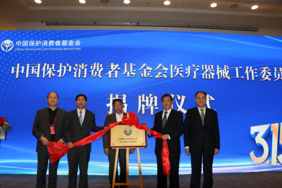 牛青山(右二)、陈四光(左二)、周郑生(右一)、曹希同(中)、张旭彤(左一)共同为“中国保护消费者基金会医疗器械工作委员会”揭牌