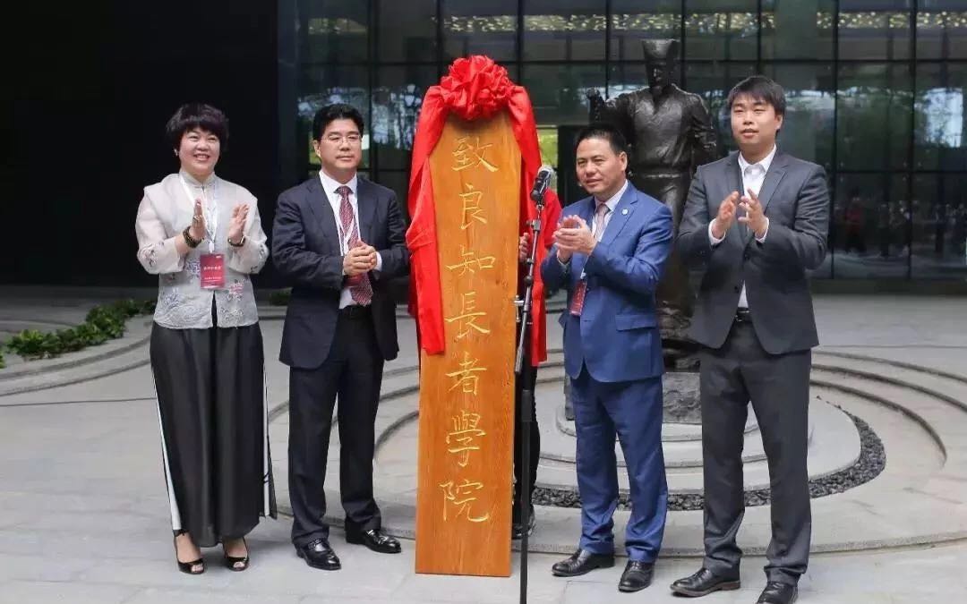 ↑ 康恩贝集团有限公司董事长胡季强,远东控股集团创始人、董事局主席、党委书记蒋锡培为九如城致良知长者学院进行隆重揭牌,上海来伊份股份有限公司总裁郁瑞芬,九如城养老产业集团总经理谈俊儒共同见证。