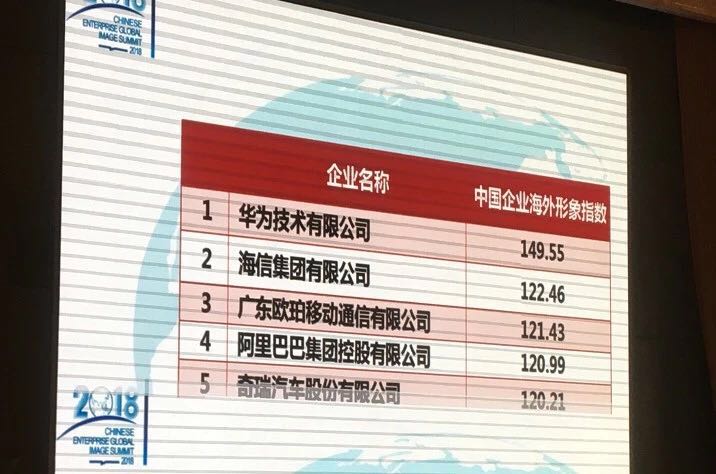 2018年12月12日,由中宣部、国务院国资委指导,中国外文局在北京正式发布的《中国企业海外形象调查报告》显示,华为和海信位居榜单前两位,OPPO和阿里巴巴分列三四名,其中海信集团还荣获中国家电行业“最佳海外形象”第一名。